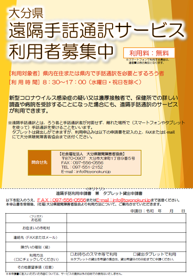 遠隔手話サービス 2020.09.162025.10.30 大分県では、平成29年度から遠隔手話通訳サービスを実施しています。 遠隔手話通訳サービスご利用前の設定のお願い。 すでに、チームスをダウンロードしている個人のパソコン・タブレット・スマートフォンで、 『大分県␣聴覚障害者センター』または『info@toyonokuni.jp』で検索し、連絡先を追加してください。 Microsoft Teamsのダウンロード方法 下記、QRコードを読み取りダウンロードしてください。 遠隔手話利用申請書兼タブレット貸出申請書 タブレット端末借受申込書